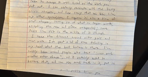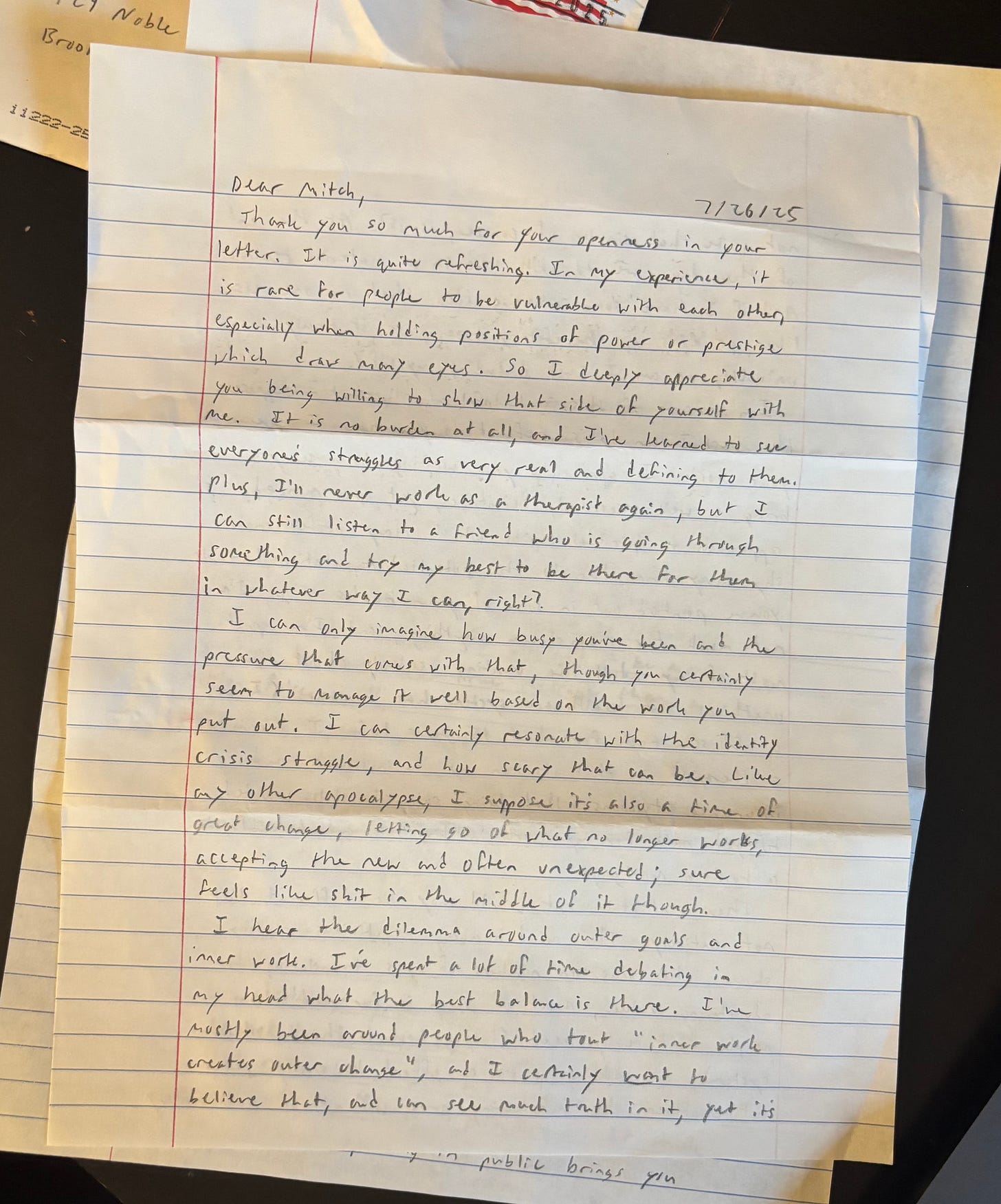Thank you so much for your openness in your letter. It is quite refreshing. In my experience, it is rare for people to be vulnerable with each other, especially when holding positions of power or prestige which draw many eyes. So I deeply appreciate your being willing to show that side of yourself with me. It is no burden at all, and Iβve learned to see everyoneβs struggles as very real and defining to them. Plus, Iβll never work as a therapist again, but I can still listen to a friend and try to be there for them in whatever way I can, right?